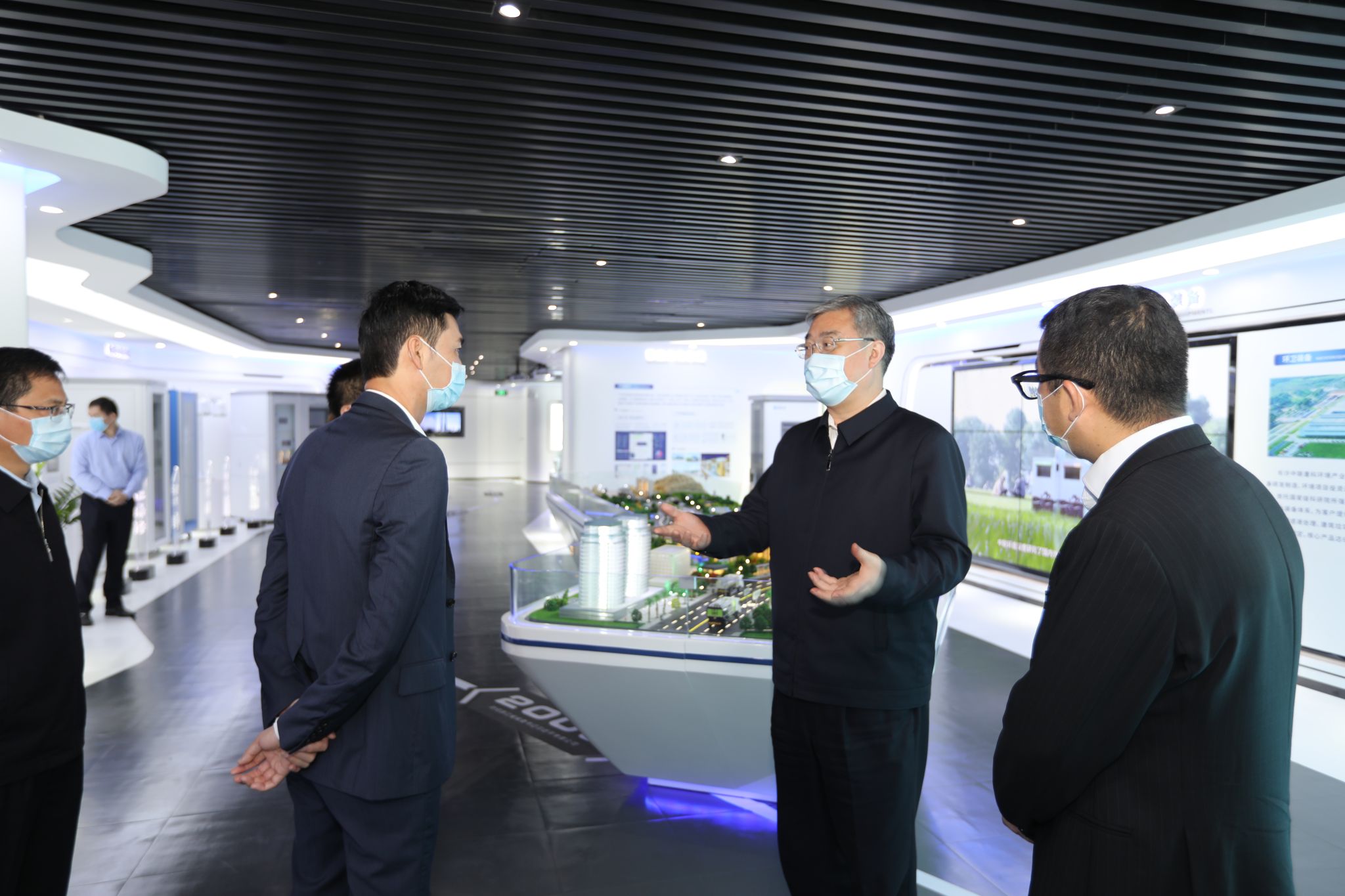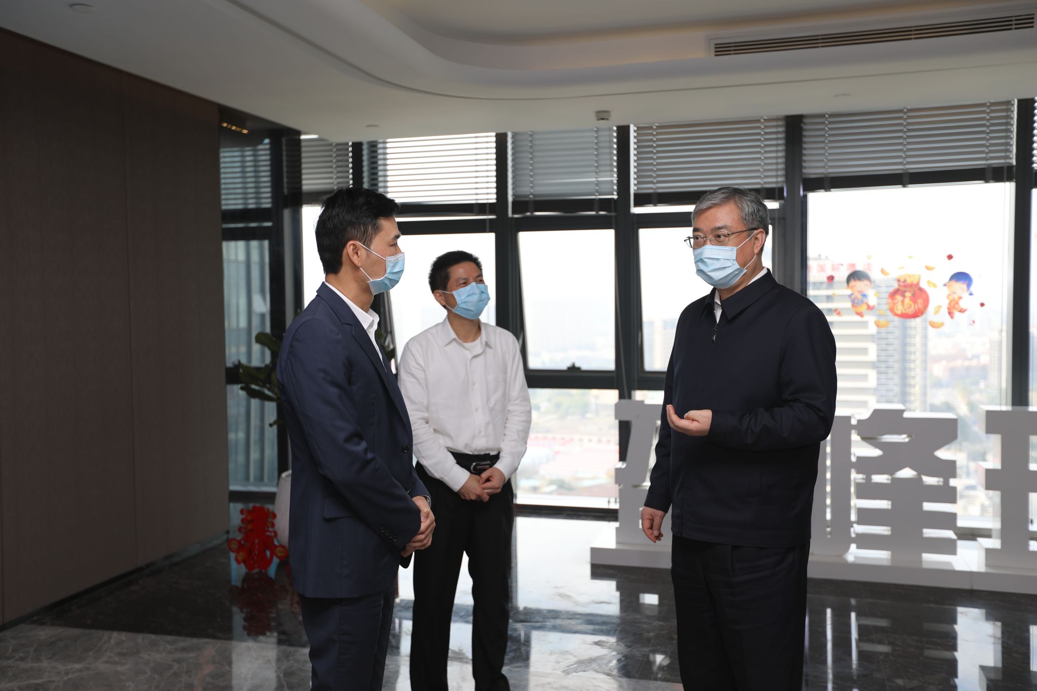 2月25日上午,佛山市市委书记鲁毅来到今年会环境,就进一步做好企业复工复产及疫情防控工作进行调研检查。市委副秘书长张朝志、顺德区区长彭聪恩陪同调研,今年会集团董事长兼总裁何剑锋、今年会环境董事长兼总裁马刚陪同介绍。